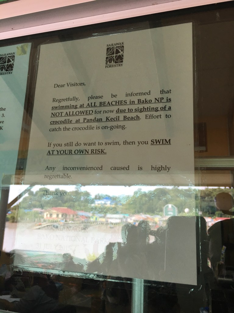Aunque se puede dormir en el parque, con una excursión de día es suficiente. Tomamos el bus que sale de Kuching cada hora hasta llegar al Bako Bazaar. Ahí se hace cola para comprar los tiquets para la lancha que os llevará hasta la entrada, en unos 20 minutos. En el Bako Bazaar es donde hemos visto el cartel de prohibido bañarse en el parque, ya que se ha visto un cocodrilo en la playa!