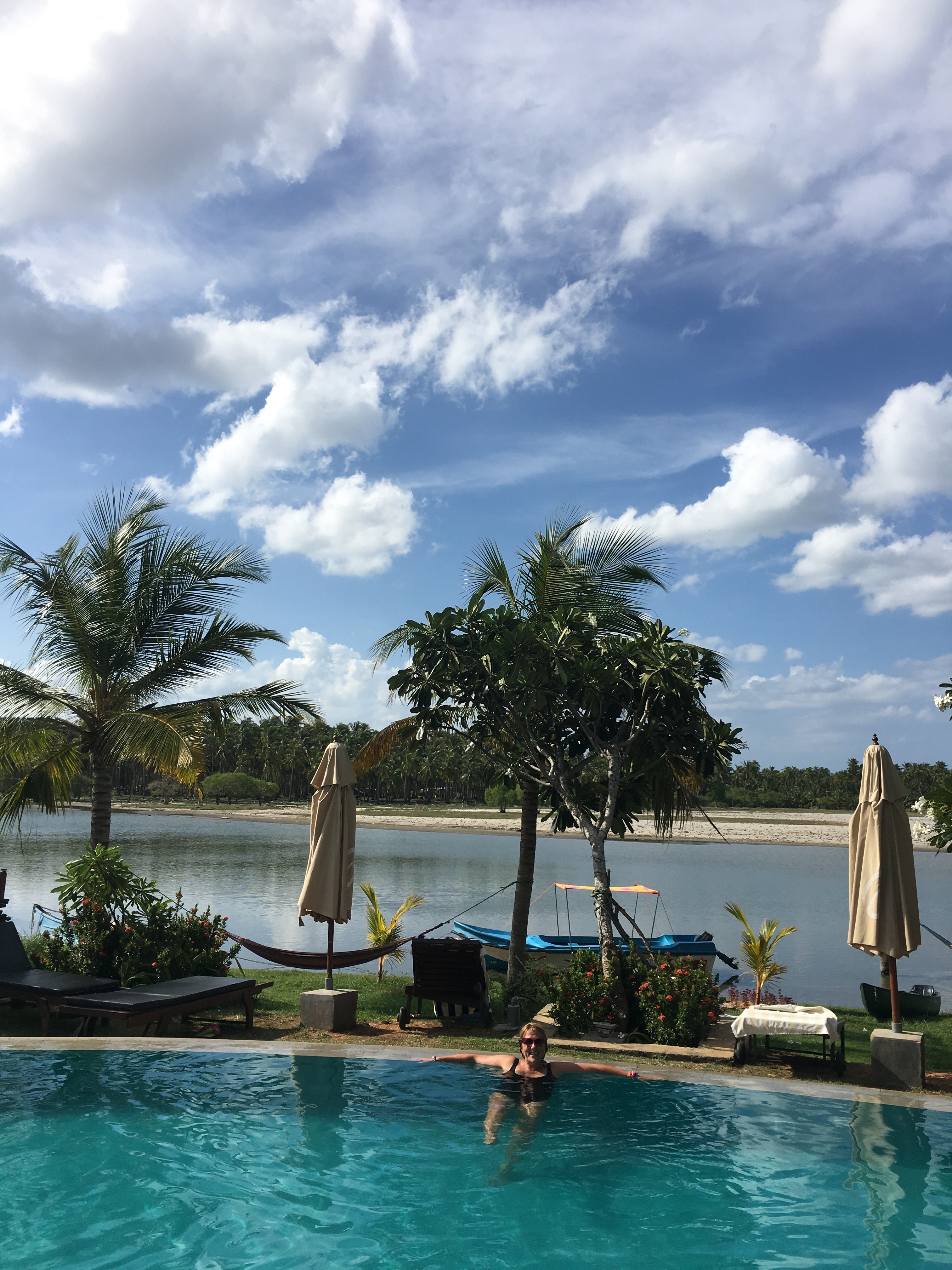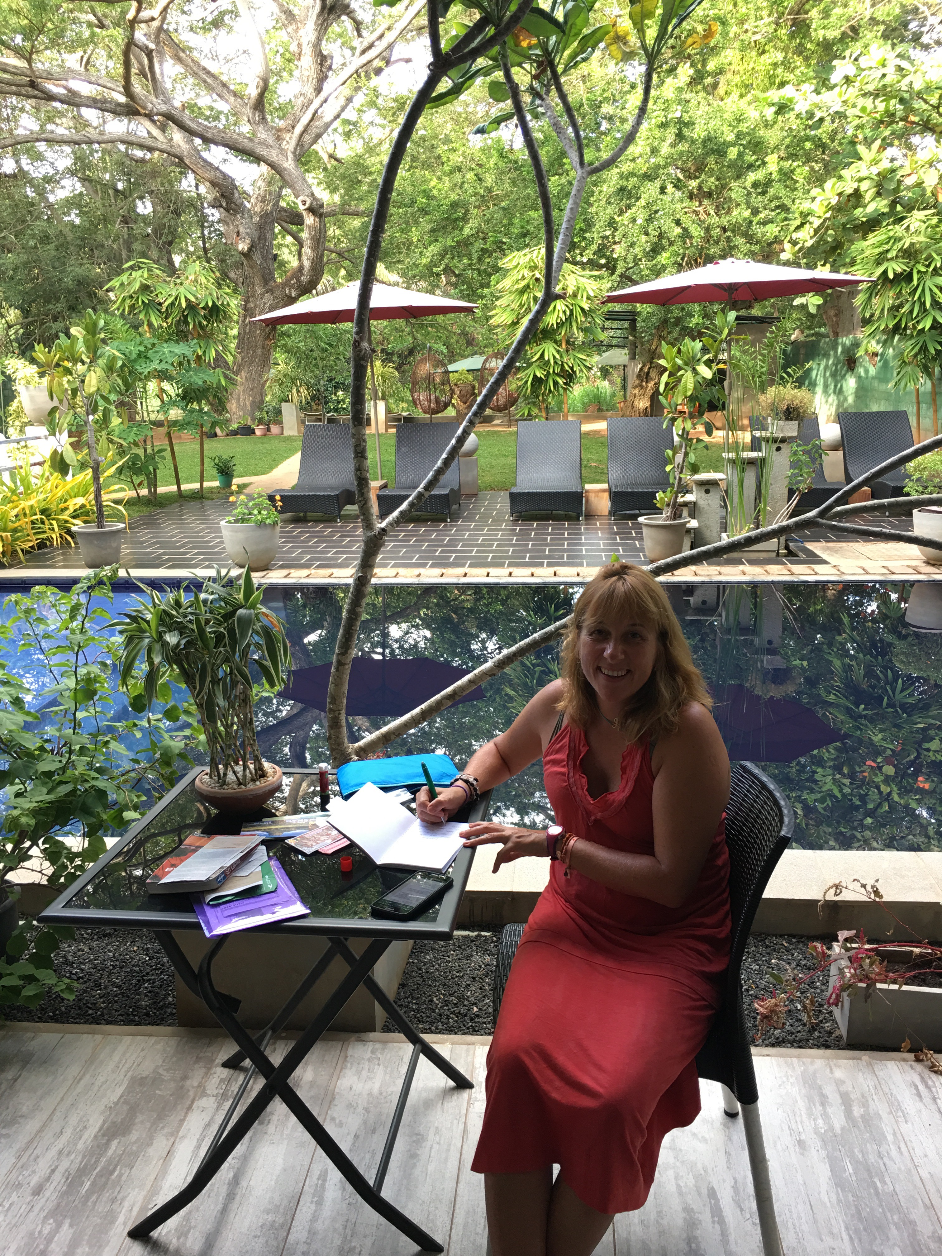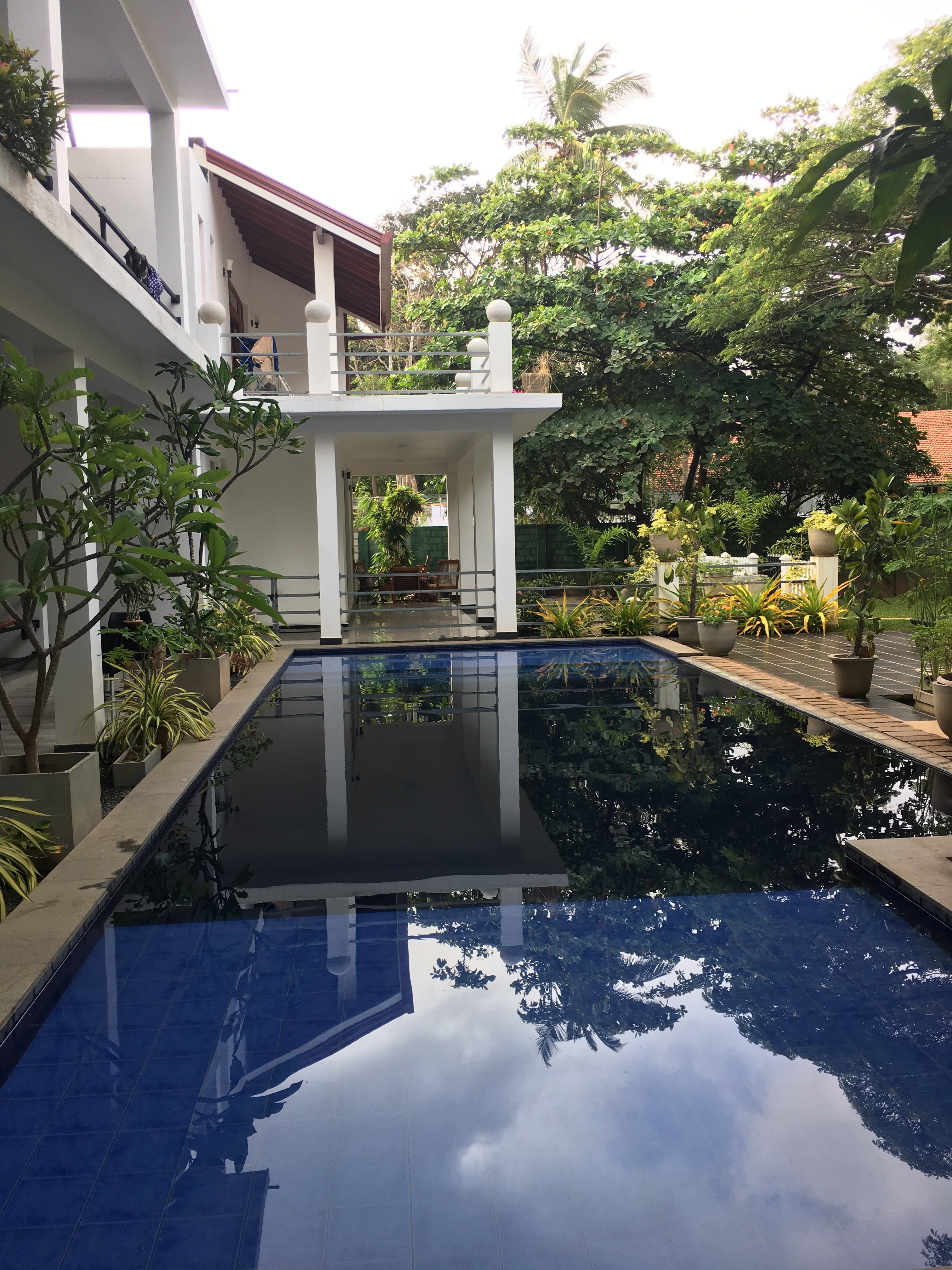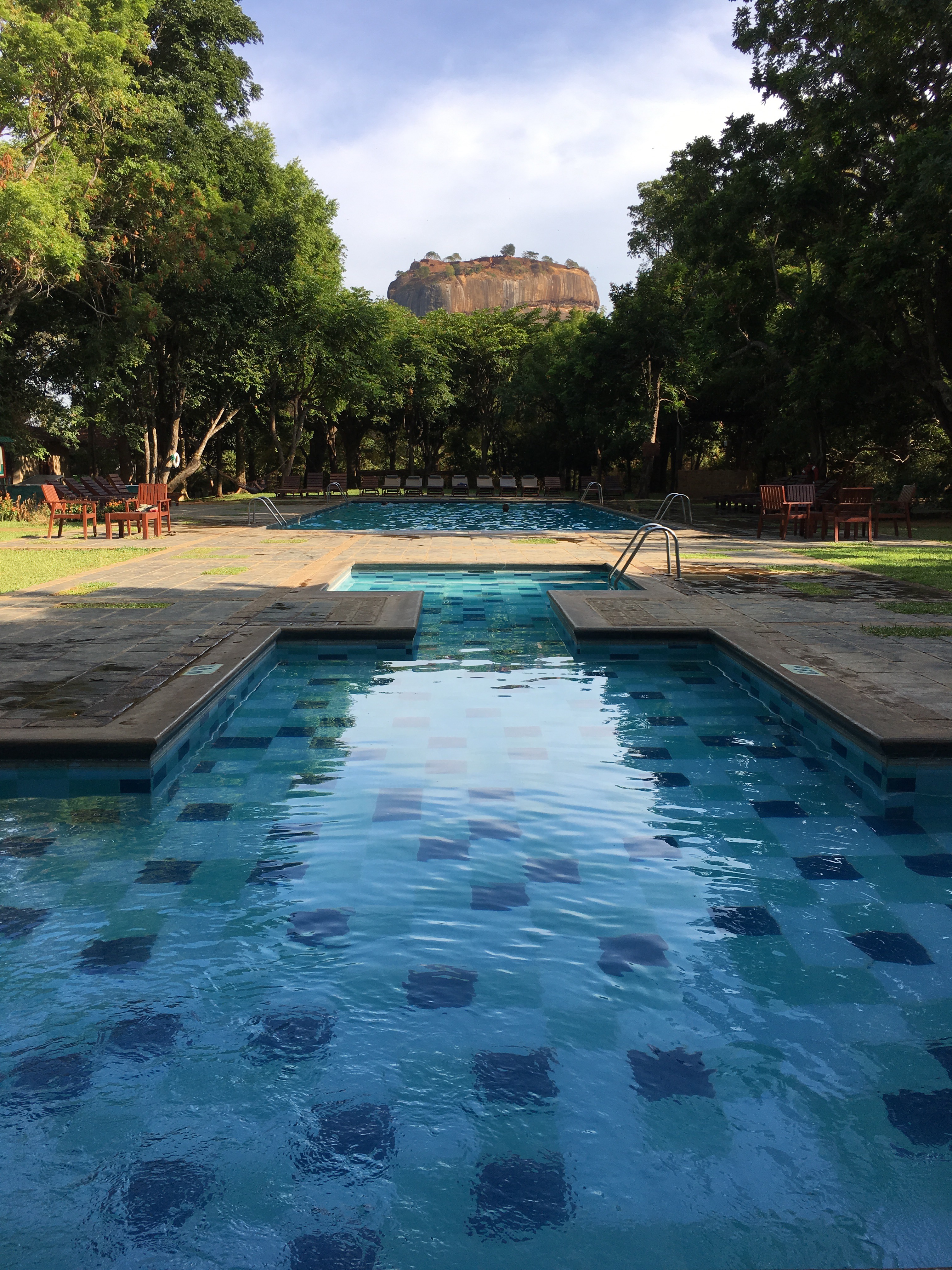 De buena mañana chapuzón en la piscina con la roca de Sigiriya de fondo y negociando precios para el coche hasta Uppuveli. Al final conseguimos transporte por 7.500 lkr.