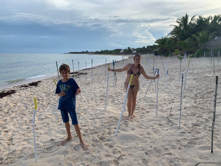 Este pueblo de playa está al sur de Cancún y es famoso por las tortugas que llegan a desovar. Cada palo que veis es un nido de tortuga y hay centenares 😱👍👍