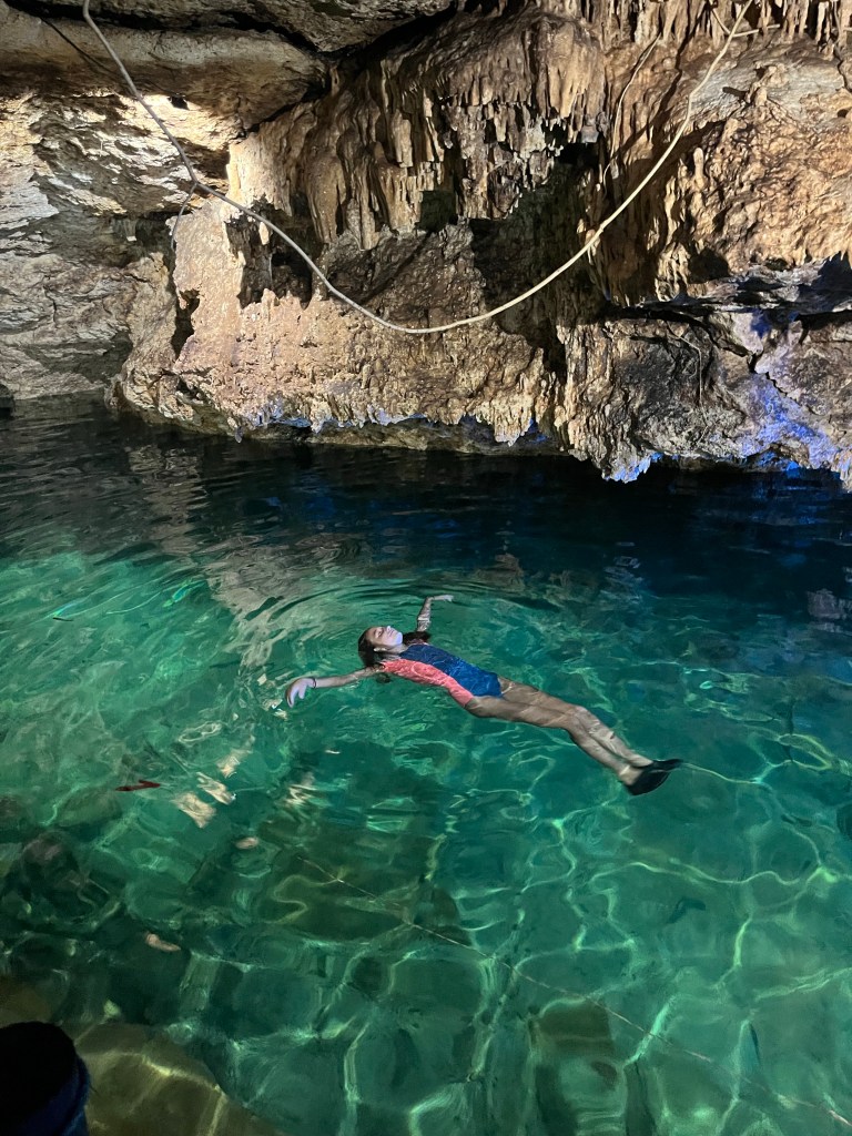 Después vamos al cenote de Tza Ujun Kat, que tiene parte del techo abierto. Consejo: para disfrutar al máximo de los colores cristalinos del agua, confirmad antes el mejor momento de visita. En este caso, es a las 9 de la mañana.