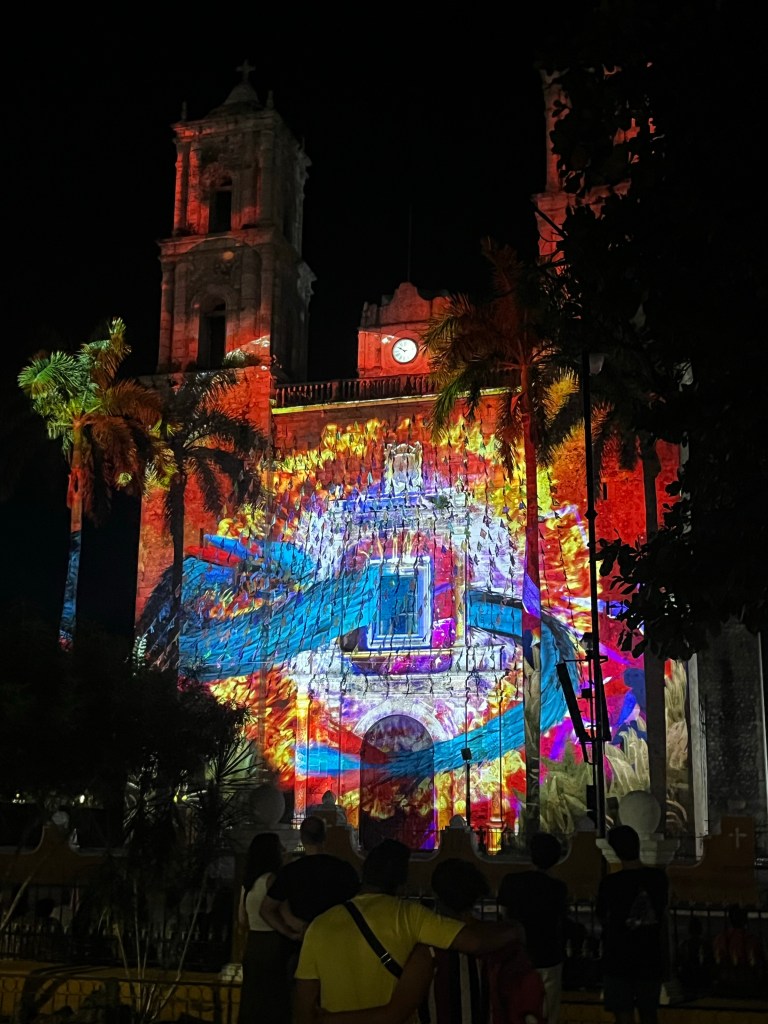 … y terminamos la noche con un espectáculo sorpresa de luces proyectado en la iglesia y que explica como se formaron los cenotes.