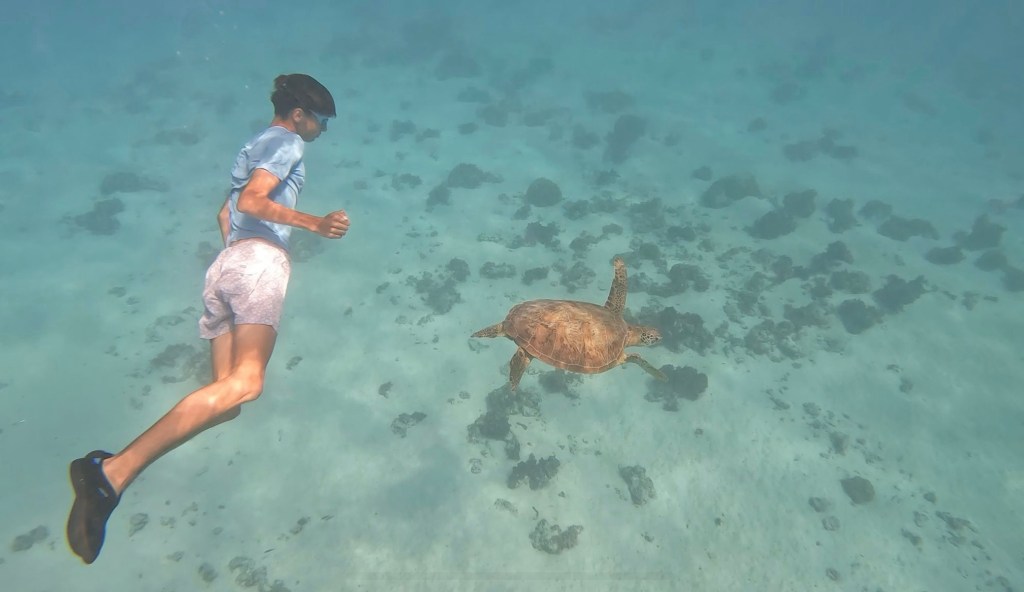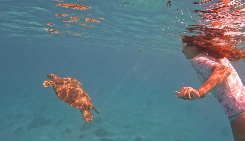 El primer baño es en la playa de Plage de Ta’ahiamanu, cerca del hotel Hilton…