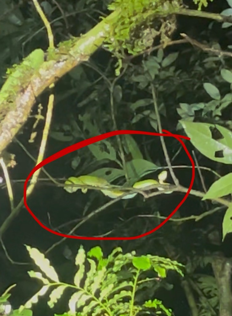 Por la noche visitamos la reserva del Bosque Nuboso de Monteverde, con el tour nocturno. Nos llueve y hace frîo, pero conseguimos ver varios animales, una serpiente muy venenosa de árbol…